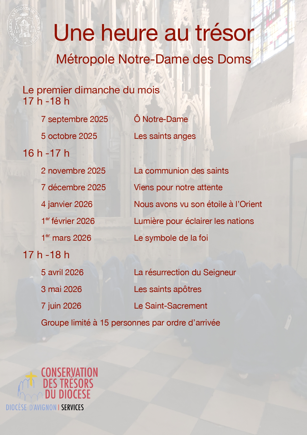 voir dans ce patrimoine religieux la mémoire d’un peuple. C’est un patrimoine vivant, légué par des croyants d’hier au peuple des croyants ou non croyants d’aujourd’hui. Dans les Trésors d’Art Sacrés, le peuple de Dieu peut reconnaître son histoire et le reflet de la dévotion de ce peuple au long des siècles : ce n’est pas un musée d’art sacré. Le mot de Trésor nous appelle à ne jamais séparer la valeur culturelle des objets qui le constituent de leur destination religieuse, mais à contempler leur beauté comme un doigt désignant Celui pour lequel ils ont été faits. C’est dans cet esprit que Mme Silvestre nous accueillera au Trésor de la Métropole."