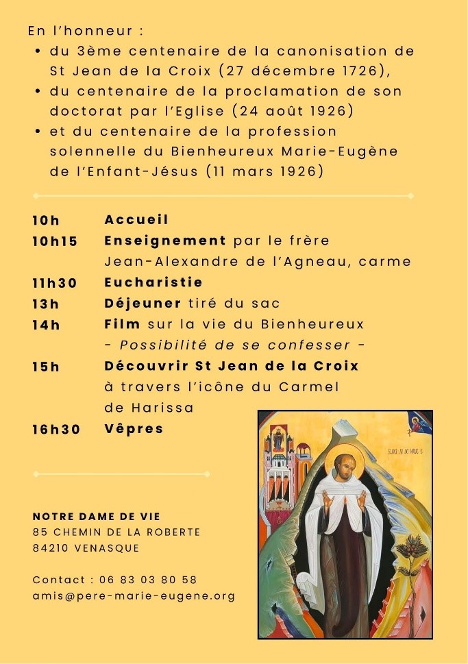 Rendez vous à Notre Dame de Vie à Venasque pour un temps d’enseignement, et de prière faisant dialoguer le père Marie-Eugène et St Jean de la Croix, docteur de l’Eglise. En effet, cette année, la famille carmélitaine célèbre le premier centenaire du doctorat de ce saint espagnol et le troisième centenaire de sa canonisation