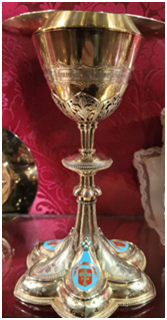 Celui-ci date de 1880. Il est en vermeil avec, ce qui est remarquable, des émaux cloisonnés. C’est un petit calice puisqu’il ne mesure que 21 centimètres de haut.